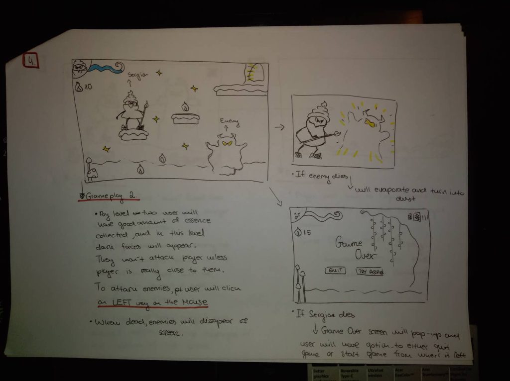 Images above are showing the very first prototype iteration of our game. This prototype was created before we even done the research for this project and it represented our initial idea for the game – how we, as developers, would like it to look. Our initial prototype was representing a game that would allow user to choose between three characters to play – Forest Spirit, Guard and Little Forest Fire. Depending on what player user chooses we had an idea to create a completely different game plays for them, so users would have different experiences. From our research later, and discussing our skills when it comes to programming such complex game play, we have decided no to include features mentioned above in our game, since it would take too much time and also users prefer something simpler.