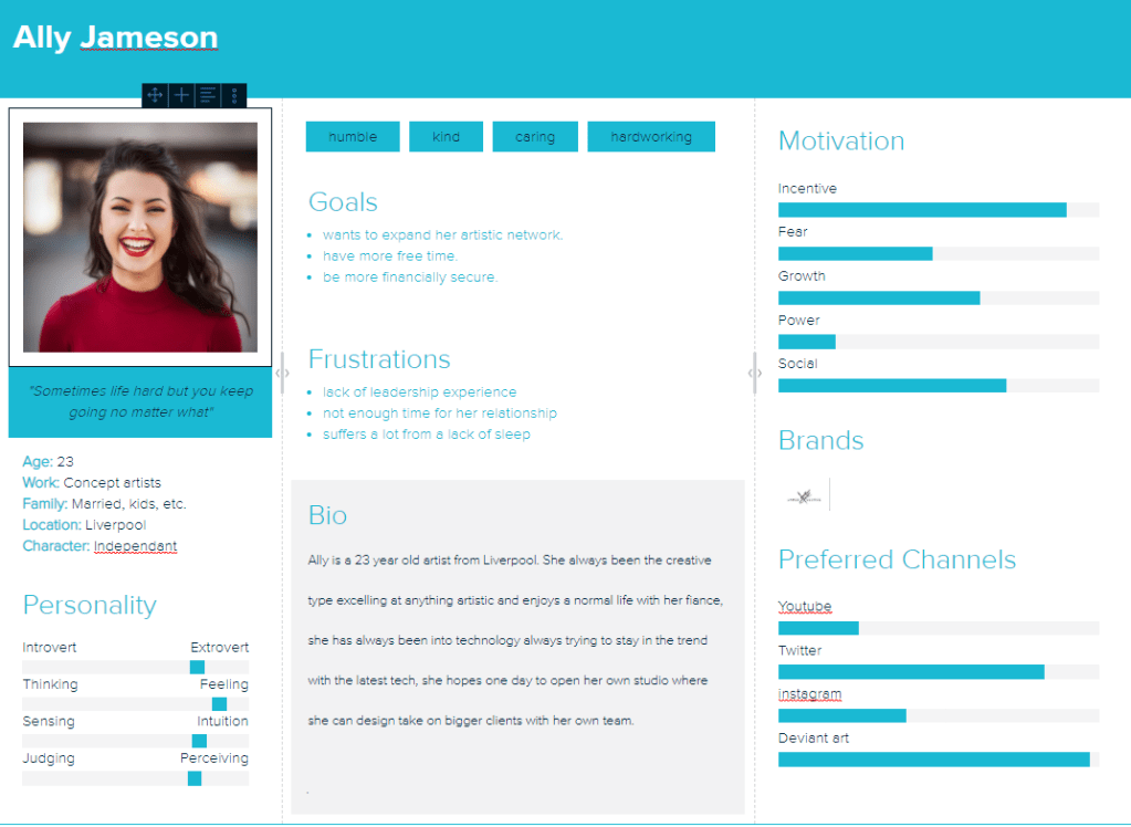 Ally Jameson is a 23 year old three-dimensional model designer from Liverpool, United Kingdom. She studied Game Design and Concept Art and is very creative person. Ally is living with her husband and works as Concept Artist. She is very honest, critical, artsy, outgoing and creative. Her hobbies are drawing, painting,hiking, gymnastics and playing games. Her goal is to work on herself and become better artist than she is now, as well as to find new art that will inspire her. She is good at both technology and gaming, and her social skills are impressive. Our game would be interesting to someone like Ally as it has very nice and specific design and it would probably be something that she would find nice, cute and inspiring.