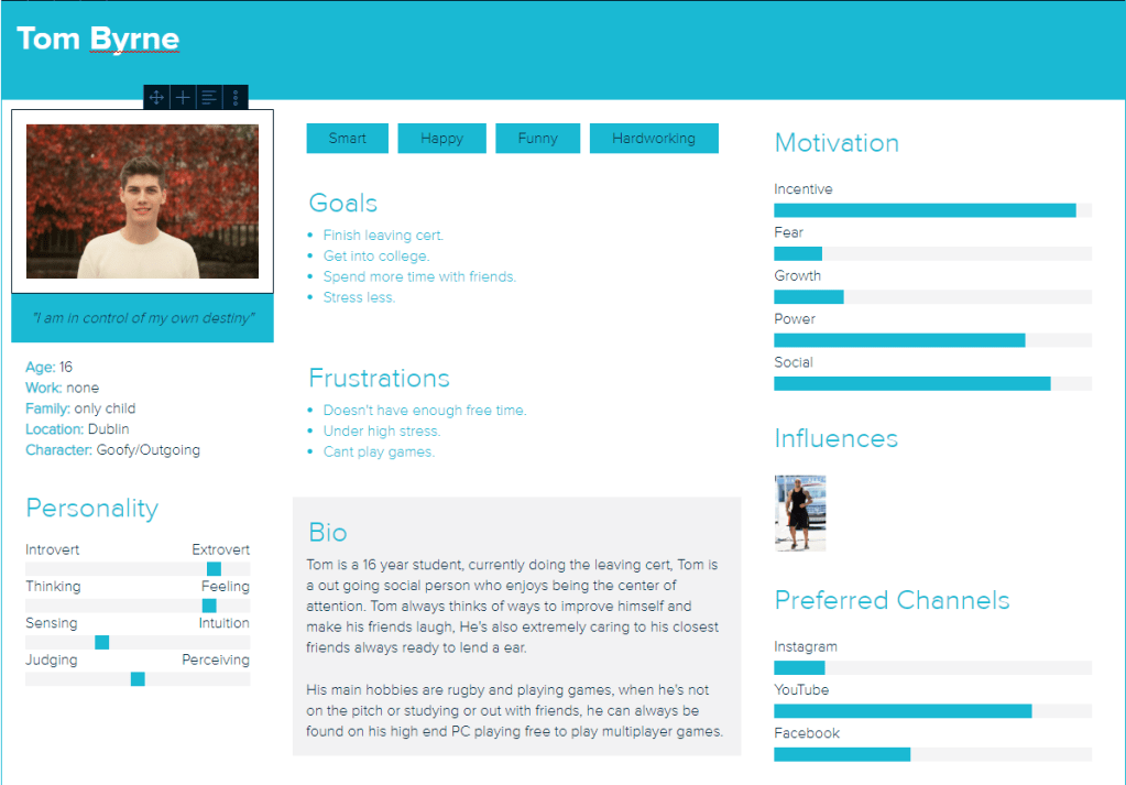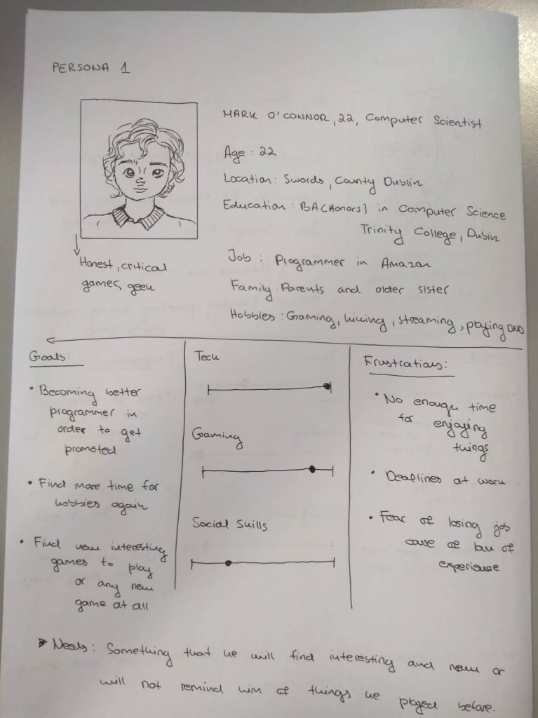 First persona that we created is called Tom Byrne, he is sixteen year old Leaving Cert student from Dublin. While doing our research, we were not allowed to collect data from minors because of ethical reasons, we agreed on creating one persona that will be underage because we showed some of our ideas to our younger family members and they seemed to like it, and also, we believe that teenagers (from 13 to 17) would be very interested in our game.