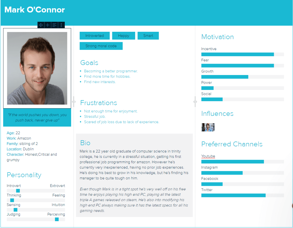 For our second persona we created Mark O’Connor, 22 year old programmer. From our research for this project, Mark falls into the group of people between ages of 18 and 24, young adults, with possible gaming history, who would like to play our game. Although we are mainly targeting teenagers, we believe that young adults would also be a good target audience since most of them were teens when two-dimensional games were at it’s prime, and would appreciate something that would remind them of their childhood.