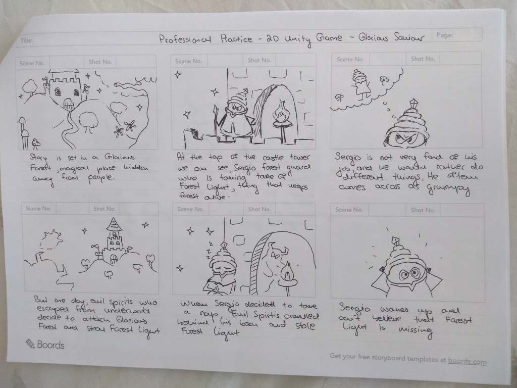 For final idea, we agreed on creating is a 2D adventure – fantasy game called Final Saviour created in Unity 2D mode. Game is set in a magical and mystical forest called Glorious Forest and follows the story of grumpy, but yet funny forest guard Sergio who has a task to protect it against the dark and evil forces and bring back The Forest Light, thing that makes it magical. On his way to save the forest player will have to control Sergio and help him defeat the dark forces. For this game we also created very detailed storyboard.