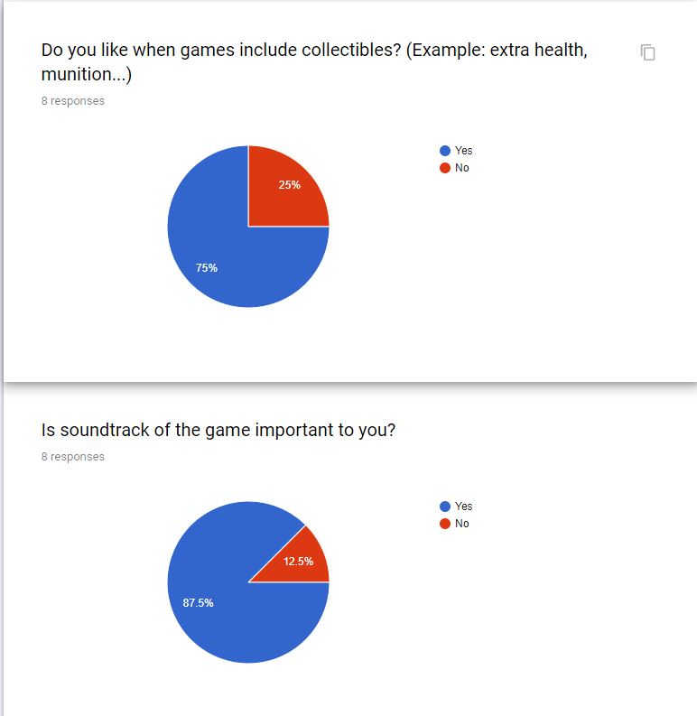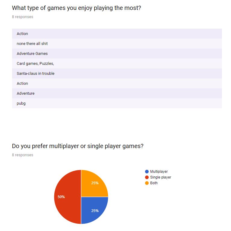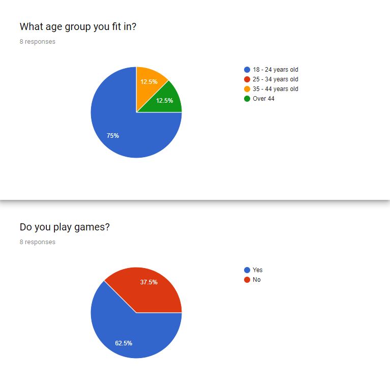 For the purpose of gathering user information and requirements for project we have created an online survey in Google Forms. At the beginning of the survey, it is explained to the participants what it has about and gave them instructions on how to answer it. The Survey required from participants to watch two short game play videos of our inspirations for the project (Child of Light and Never Alone) and answer questions based on the videos they watched. The Survey started with easy and basic questions about their age groups and their gaming history, and then moved onto the questions about design and ones connected to the videos they have seen.