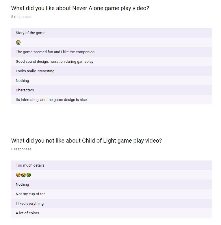 Referring to their answers about two videos that they have watched, most of them said they enjoyed Child of Light game play more than Never Alone game play, as (according to them) game art is better, there is more sounds, seems very mysterious, bright colors and the only critic of this game was that is has too much details.